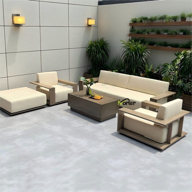 5. Outdoor-Sofa aus Teakholz: Hergestellt aus äußerst wetterbeständigem Naturteakholz, zeichnet sich dieses Sofa durch eine feine Maserung und hohe Stabilität aus und entwickelt mit der Nutzung ein luxuriöseres Gefühl, was es zu einer klassischen Wahl für die Gestaltung eines hochwertigen Balkons im Resort-Stil macht.
