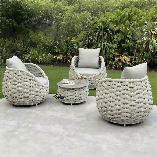 4.Seil-Außensofa: Das handgeflochtene Seildesign ist optisch leicht und atmungsaktiv, und der Aluminiumrahmen verleiht einen modernen Touch. Durch die Kombination von Komfort und Kunstfertigkeit ist es eine beliebte Wahl für die Gestaltung eines anspruchsvollen Balkons.