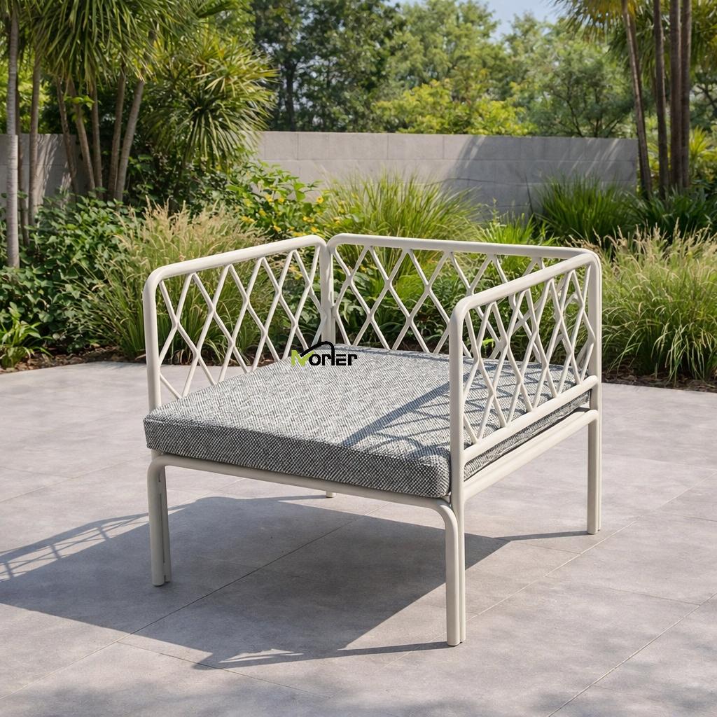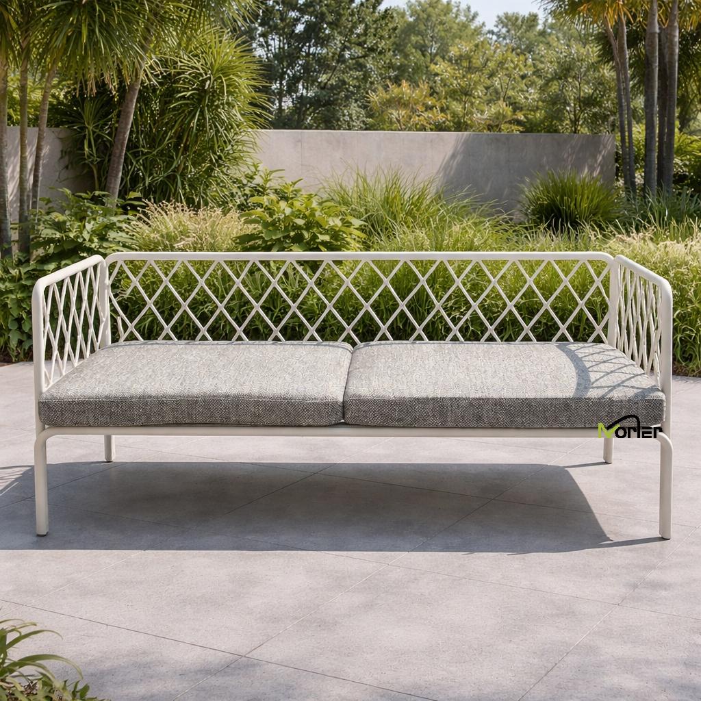 Diese moderne Sofagarnitur für den Außenbereich zeichnet sich durch ein klares und minimalistisches Design mit einem wunderschön gearbeiteten geometrischen Metallrahmen aus. Die offene Gitterstruktur sorgt für ein leichtes und elegantes Erscheinungsbild und sorgt gleichzeitig für eine starke strukturelle Unterstützung.
